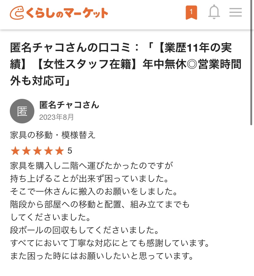 今回は、”くらしのマーケット”さん経由でお問い合わせいただきましたお客様の口コミのご紹介となります。