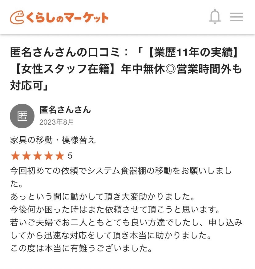 今回は、”くらしのマーケット”さん経由でお問い合わせいただきましたお客様の口コミの紹介となります。