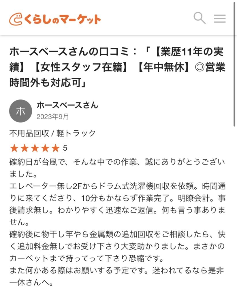 今回は、”くらしのマーケット”さん経由でお問い合わせいただきましたお客様の口コミの紹介となります。